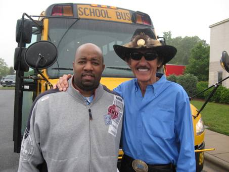 Richard Petty rode a school bus for the shoot with Terry Campbell driving. “He reminisced about riding buses as a youngster” Terry commented about his few minutes spent with Petty, who he described as “very Tall and a gentleman.” In all, Petty donated about 90 minutes or the shoot. Rhonda commented “another film crew was filming us while we were filming”. Even though Richard Petty is no longer racing, his life is busier than ever making public appearances and helping run day to day operations at Richard Petty Motorsports.