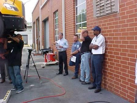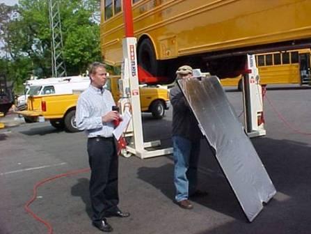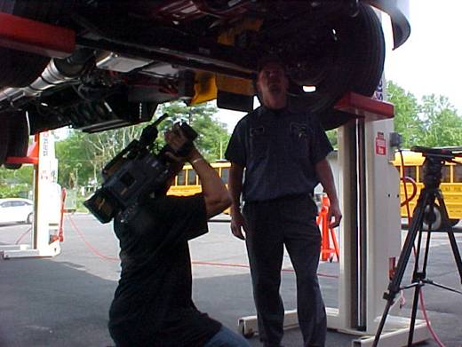 Production began on the inspection part of the new video at the Forsyth County school bus garage on April 29. Filming & production is being provided by the Forsyth County school system video production department. “They have a production studio that would rival any small TV station in the USA” states Randy Henson who serves on the committee. “Chris Runge & TJ James are going to produce a high quality DVD that will serve our inspection training needs for the next 5 years or so”. The committee is planning to produce several videos including one which details inspection of brakes and another which will cover “lift safety”.