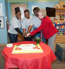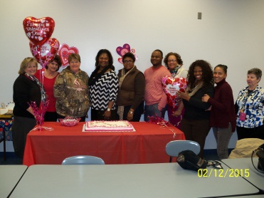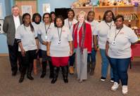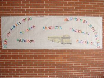 In Duplin County a school proudly displayed a banner of appreciation. Some Craven County drivers pose with transportation director Toni Floyd and their LOVE THE BUS cake. |