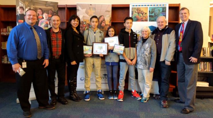 In congratulating the winners, the North Carolina Department of Public Instruction’s Transportation Services Section Chief Derek Graham said, “Each of these students is to be commended for helping remind all motorists to be careful when encountering a stopped school bus.” Graham and Guilford County transportation director Jeff Harris made a special visit to Jamestown Middle School to offer congratulations. Each of the three siblings received a certificate featuring their artwork. State winners also received a jigsaw puzzle of their artwork and Anita receives a $250 check as a national winner. Pictured below left to right: Harris, the students’ parents, Petar, Anita, Angel, their grandparents and Graham. “The kids were beaming all day!” school administers noted. |