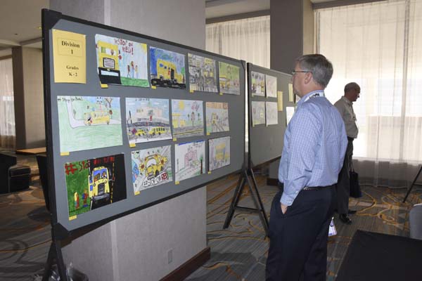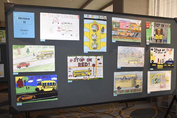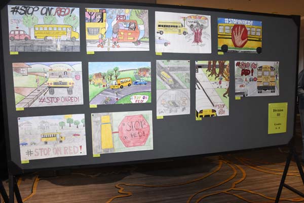 The theme for the 2016 National School Bus Safety Week poster contest was “#Stop On Red!” - a message to the motoring public to STOP when they see the flashing red lights and stop sign, which means that students are boarding or exiting the bus. Over 3,000 times every school day a motorist in North Carolina will pass a stopped school bus. Students from across the state entered the North Carolina competition and judging took place at the North Carolina Pupil Transportation Association Conference in Asheville, NC in July. First Place winners in two of the Divisions were siblings Petar Krastev and Sister Anita Krasteva and their brother Angel Krastev finished 3rd in his Division. All three students attend Jamestown Middle School this year. As shown below, multiple boards featuring entries from across the country were displayed for judging at the National Association for Pupil Transportation Summit in Kansas City. |